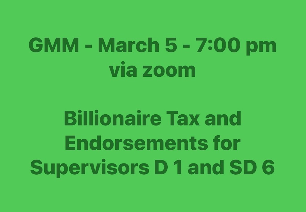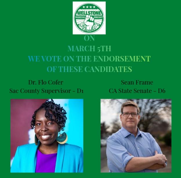 We will also be voting on endorsement for Sac County Supv D 1 and CA SD 6 candidates