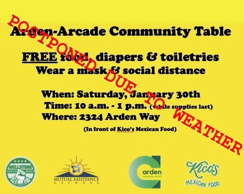 ARDEN-ARCADE, Calif. – The Arden-Arcade Community Table scheduled for Saturday, Jan. 30 has been postponed due to severe weather conditions affecting the Sacramento region. The organizers – Wellstone Progressive Democrats of Sacramento, Arden Community Council and Mutual Assistance Network – hope to reschedule the event for a future date in February.