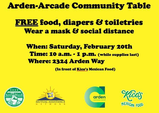ARDEN-ARCADE, Calif. – The Arden-Arcade Community Table has been rescheduled for Saturday, Feb. 20, and will last from 10 a.m. to 1 p.m. or until supplies run out. The event – a food, toiletry, and diaper distribution – will still be held in front of Kico’s Mexican Food at 2324 Arden Way.