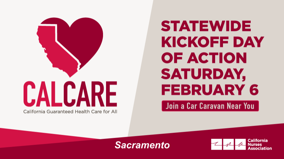 Our friends at the California Nurses Association (CNA) are hosting a local car caravan this Saturday, Feb. 6, to urge state legislators to pass California Guaranteed Health Care for All (CalCare).